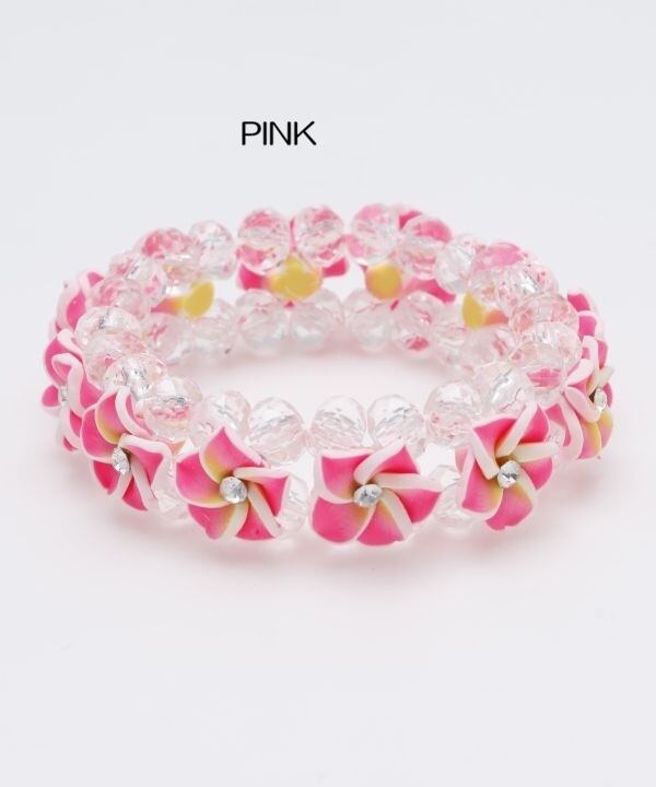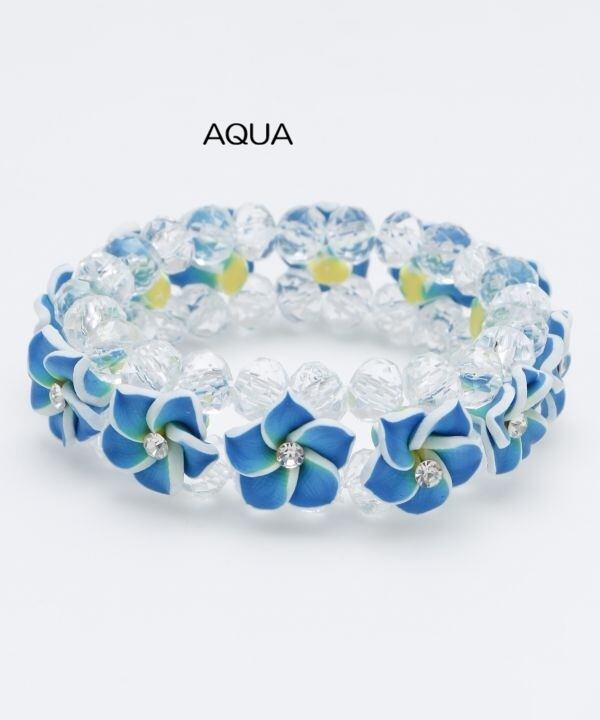 プルメリアのモチーフが全体にあしらわれたブレスレット。鮮やかなカラーのモチーフとクリスタルビーズが、華やかなHAWAIIを演出してくれます。