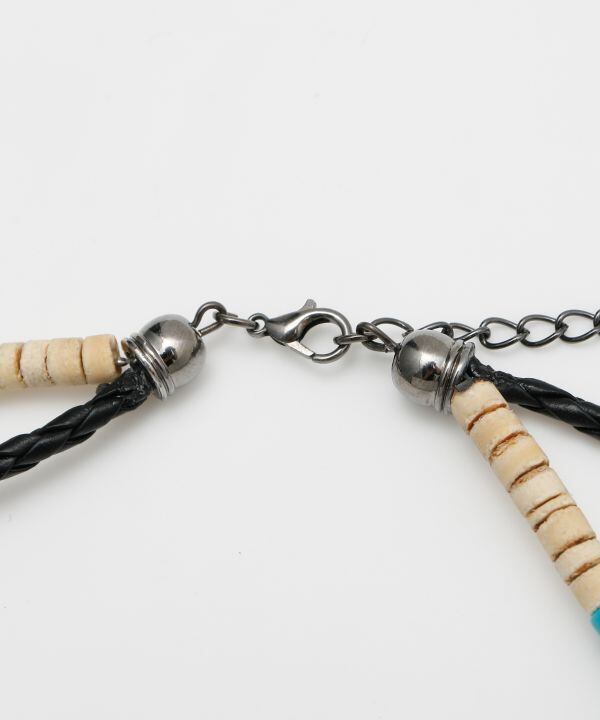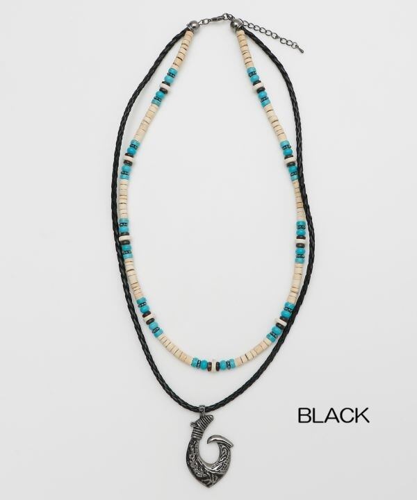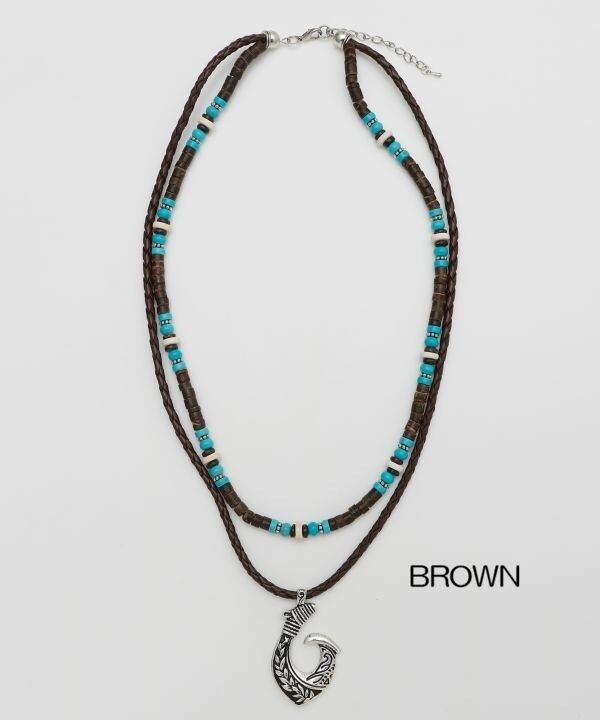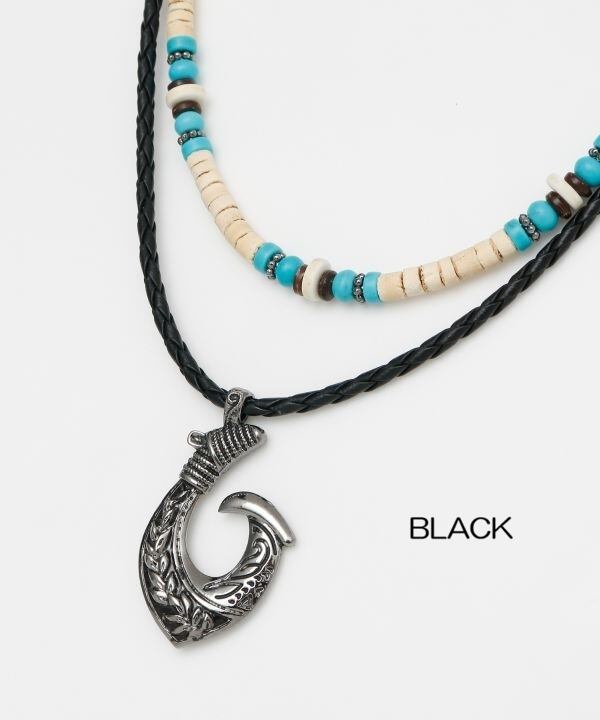 メタル×天然素材を組み合わせたボリュームネックレス。フィッシュフックモチーフは幸運を呼ぶお守りとされ、旅や海を感じるスタイルにぴったり。存在感あるデザインで胸元を印象的に演出します。