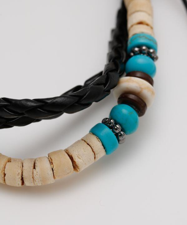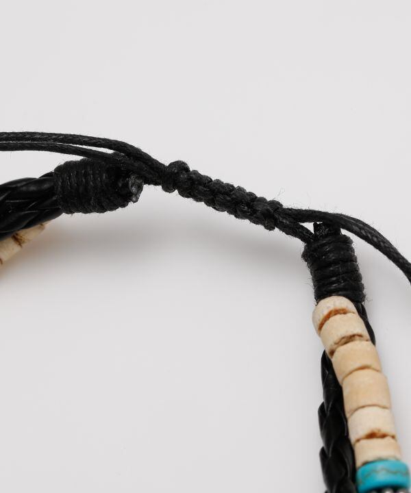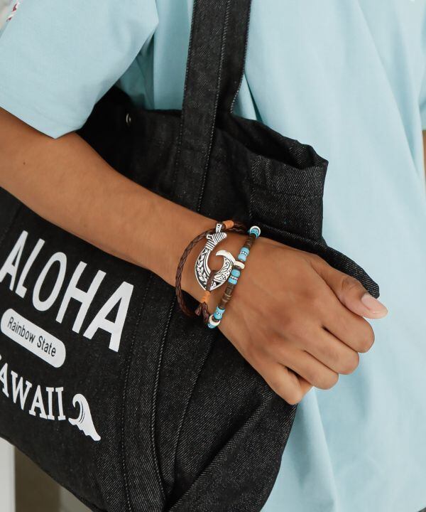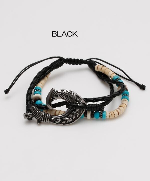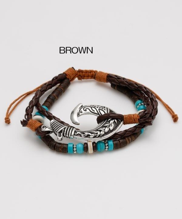 天然素材の風合いが魅力のメンズブレスレット。編み込みデザインとメタルパーツが程よく調和し、カジュアルスタイルを格上げ。フィッシュフックモチーフは幸運を呼ぶお守りとして人気のモチーフです。