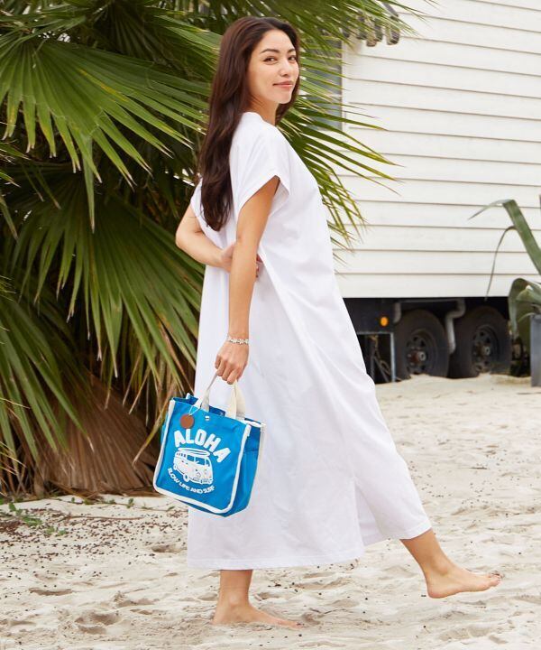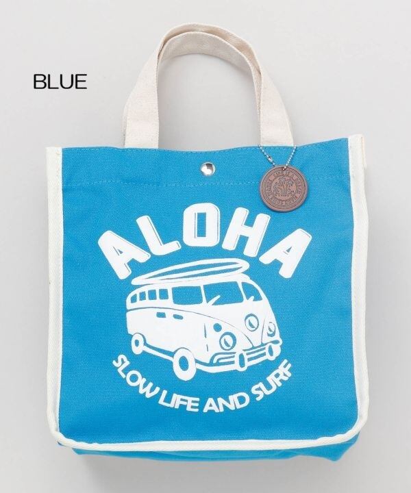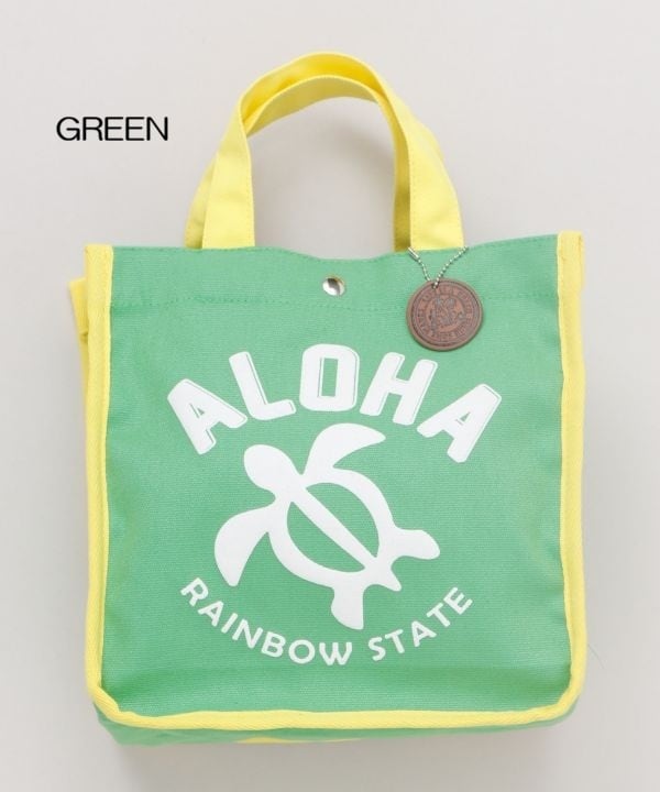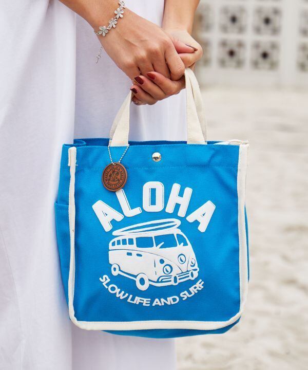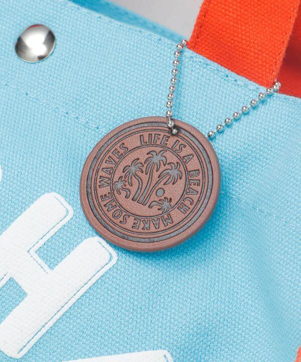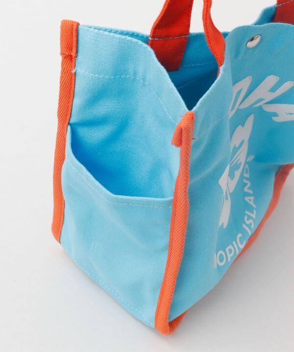 パイピングの配色が印象的なミニトート。便利なサイドポケットが2個ついており、ヤシが刻印された合皮のチャームもポイント。ハワイを連想させるデザインが発泡プリントで施され,お出かけをより一層楽しくさせてくれます。内ポケット付き。